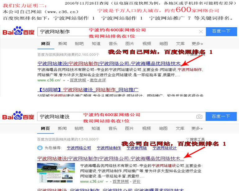 浙江省寧波市是千萬人口的大城市,約有600家網絡公司,競爭異常厲害,“寧波網站建設”“寧波網站制作”這二個關鍵詞,本公司網站多年來基本上百度快照排在第1名(360搜索也多數排名在1名)...